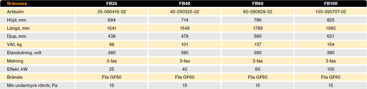 Våra flisbrännare finns i fyra olika storlekar och är utvecklade och tillverkade med den bästa tekniken för att uppfylla dagens krav på en driftsäker, miljövänlig och lättskött fliseldning. Eftersom de alla är utrustade med elektronisk styrning och övervakning kan de eldas dygnet runt och året om. Oavsett vilken av våra flisbrännare du än väljer kan du vara säker på att den garanterat kommer att täcka just ditt energibehov och att du får en miljövänlig, ekonomisk och säker produkt.